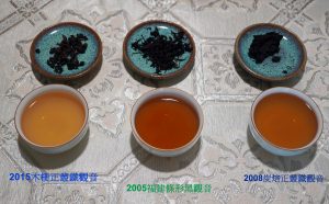 春天本該細雨潤無聲,綿綿煙霧山嵐繚繞,怎奈春雨遲候,水情告急,今天才聽到淅瀝雨聲夾雜悶雷在天邊轟隆一聲……..社區山坡地林邊的小鳥許是高興壞了,一邊春雨淋漓一邊聒噪跳枝喧鬧了一回,我看著山前雨霧,突然嘴饞想喝鐵觀音,先搬出茶具以紫砂暢飲2008炭焙正叢,壓餅的陳化慢,但是滋味勻厚油滑、鐵韻夾些許巖味,有點山石蒼點的甜韻,喝過癮了,再取出2005福建黑觀音、2015木柵正叢來比對著喝,順便拍照發文讓大家用眼睛看茶……。