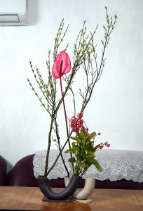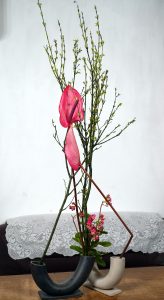 【雙曲芽秀】雙曲開口花器線條,楓葉芽、長壽花、火鶴,花葉枝條勃發的生雞,共同詮演簡雅的春意。 @真巡花藝