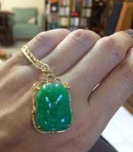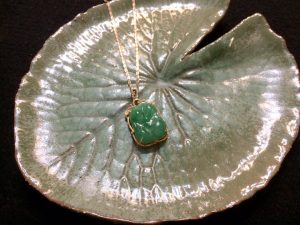 【翠色荷葉】 晶瑩小方,透亮厚實的陽綠荷葉,一見歡喜。 23.7*17.8*5.7mm 4.77g 遙想小池疏雨後,田田秀蓮,點雨清新,就像歐陽修說的, 有那「翠色弄清漪」之嬌色。 玉有玉緣,小巧翠色,設計委作成器,且停駐我頸項間。 On 2017-09-21