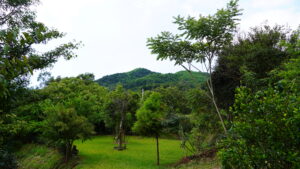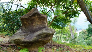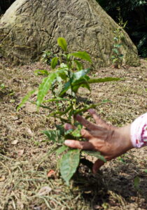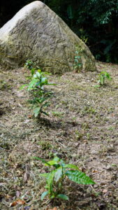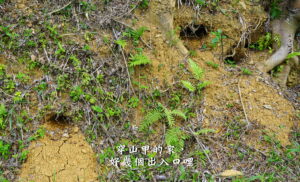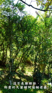 三峽插角梢楠湖這一小區台灣山茶試種區,旁邊是雜樹林和竹林,森林覆蓋率達85%以上,地下嶙峋岩塊頗多,礦物質豐富,黃壤土質有機質豐富,對適合有性繁殖的大葉種台灣山茶來說,有加分效果;園主阿亮說今冬可以適度疏種一些原生樹小苗,模擬台灣山茶適合茶樹與林木或果樹林間混種的特性。