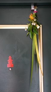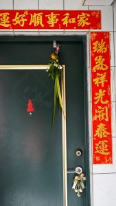 前天上插花課,幫學生買一些菖蒲艾草,應景也沾點過節氣氛;掛蒲艾趨避自古有之,現代人大都不講究了,今年就順應因緣「蒲艾簪門」;菖蒲也常應用在花藝作品中,自古以來被認為根性強壯,天生具有至陽之性,百寒不侵,為天中五瑞之首,形似古代太阿劍,插在門口可以避邪,故有蒲劍斬千邪之說;而艾草作旗:「門掛艾旗驅百病,戶懸蒲劍斬千邪」,艾草有藥理也是精油豐富的香草,以形祈願怯病的安康心願;榕樹也同樣有避邪的功用,通常也會搭配使用;現代花藝有時會加入尤加利葉等有精油香氣的葉材搭配使用,再簪一朵花,不拘蘭菊皆可,我摘下陽台自栽的菊花,搭配白色千日紅小花朵,其實就是小時候鄉間隨處可見的圓仔花改良的。選在端午清晨簪門,掛好的瞬間幸福感油然而生。