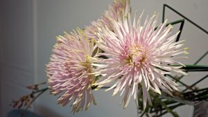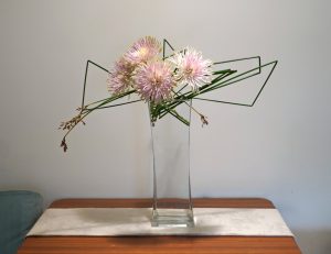 【粉靨金蕊泛流霞】盛夏,蟬鳴响喨,薰風懨懨;溽暑躲在室內靜修,動靜在心,細細覺察微細念;本是秋涼盛開的菊花,現代育種栽培技術下,全年都有團團碩美的各色菊花可折枝插取;挺水的水生植物太令隨意彎折,架出空間感,藕粉色尖瓣粉綠菊花,美得不可方物,唯有蘇軾寫菊可堪擬: 輕肌弱骨散幽葩, 更將金蕊泛流霞。 欲知卻老延齡藥, 百草摧時始起花。 簡潔清透玻璃花器帶來舒爽涼意,插成粉靨金裳花見。 @真巡花藝 On 2022-07-02