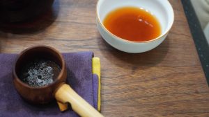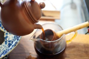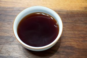 躲著酷暑烈日,拿出筆墨和皇甫誕碑練字,才練一小時就覺得心氣不足,起身活絡一下筋骨,取出一顆老沱試茶,緊壓沱據茶商判1980年代,起茶的手感和嗅聞沱茶的乾茶香氣,通常是泡茶前的例行公式之一;備器煮水,水開熱壺,置茶沖瀹,有時候我還會湊近正在蒸騰發散的紫砂壺嗅聞香氣,或者靜觀茶壺表面消散的水氣;觀起茶的第一泡第一眼茶湯是我訓練判別茶質優劣的樂趣之一,經驗值加上說不上來的靈感,有時候我就已經知曉這泡茶的取向了;就口喝下第一泡茶湯,通常三口就已大勢底定;好茶我會再泡三泡,細品茶湯口感特徵,然後痛快地喝到底朝天,茶葉能沖瀹幾泡,就跟它耗到幾泡,有一次意外收到一磚不起眼的老生磚,我竟然耐著性子泡了20泡,從下午熬到晚上,熬到我清楚滿意為止;普通口糧茶不論生熟普洱還是年份,大致試喝幾泡不浪費茶就收口了;如果一時有疑慮,掏出茶渣看葉底,想判別的問題就更清楚了。