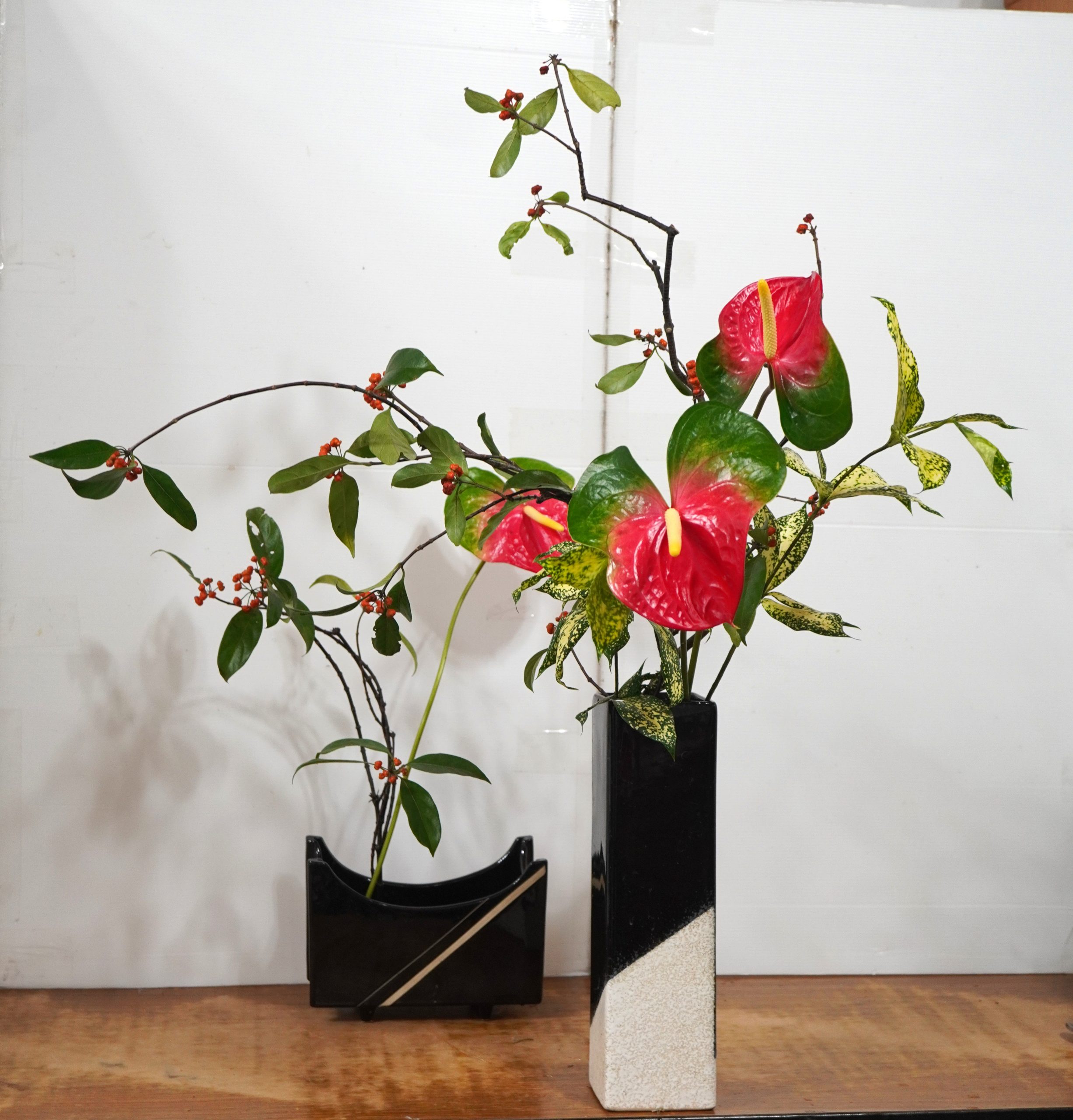 【霄見火鶴】峰云暮起,霄見紅紅火火的火鶴,室外雨霧氤氳,黑藤子迎風展枝,唯有深藏如智多星的星點木甘為配角,君臣間的左輔右弼,一如花藝,調和才能陰陽相生、政通人和。