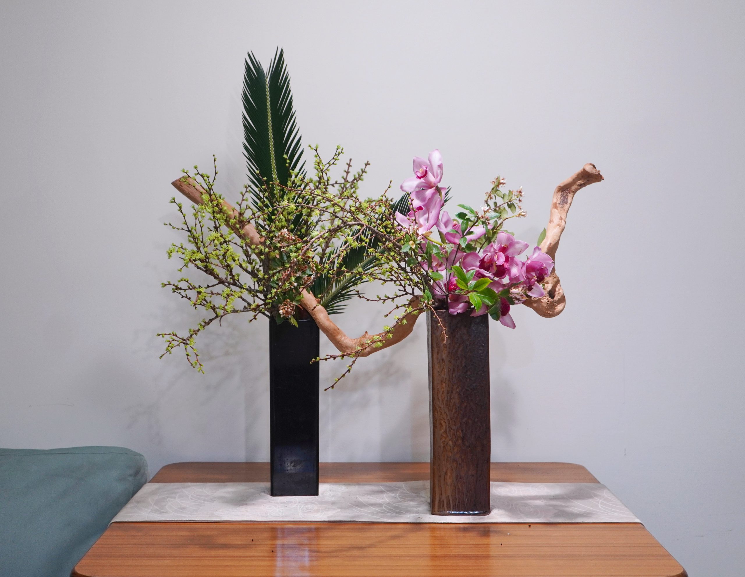 花市買來(進口非台產)虯曲醜扭的杜鵑花樹根,珩垣一架,好似造房的上樑儀式,落雨松、山櫻、東亞蘭、鐵樹在花剪鋏幾聲喀擦起落間瞬間插成。