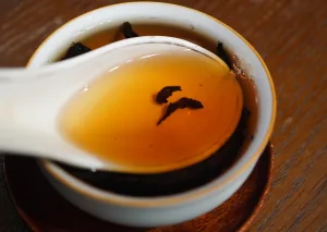 在明陳繼儒的《茶董補·製法沿革》中記載:「宋太平興國年,始置龍鳳模,遣使即北苑造龍鳳茶,以別庶飲。又一種叢生石崖,枝葉尤茂。至道初,有詔造之,別號石乳。」若茶叢生石崖者,必堅韌如松骨,耐風渴旱風霜不倒,調冶成茶必然有點桀傲的。我跟茶商閒聊,他也是岩茶高手,亦稱石乳香足火炭焙沒有放個二、三年,還不馴,他有時也泡到懷疑自己的功力…….。台灣喝岩茶能稱高手者,都是喝岩茶茶齡25年起跳,喝過百種以上才敢謙稱自己稍懂岩茶,泡茶功底更是難以窺測,可不是用蓋杯花拳繡腿表演一二的淺嚐即止….,連岩茶高手都要調冶一下有點脾性的石乳香,可見此茶之底韻深厚。