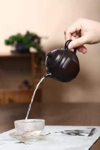 石黃石紅的茶壺,因為含鐵量高,取用比重高有沉手感也是特色之一;以開水沖淋時,石紅在高溫下胎表會泛出陣陣紅光,甚至紅中透紫…、石黃則是黑潤油亮到像塗了油似的一溜水