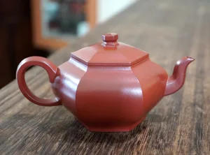 明清時留存於世部分老朱泥小壺,台灣老派玩壺者會說這是石黃朱泥,因為帶有獨特光澤和色感。我手上有一把近代石黃朱泥六方宮燈,添加相當比例石黃,練泥技術高超,六方筋紋器挺秀,手工精製技術也高超,朱紅潤澤,金屬光澤比之無倫!